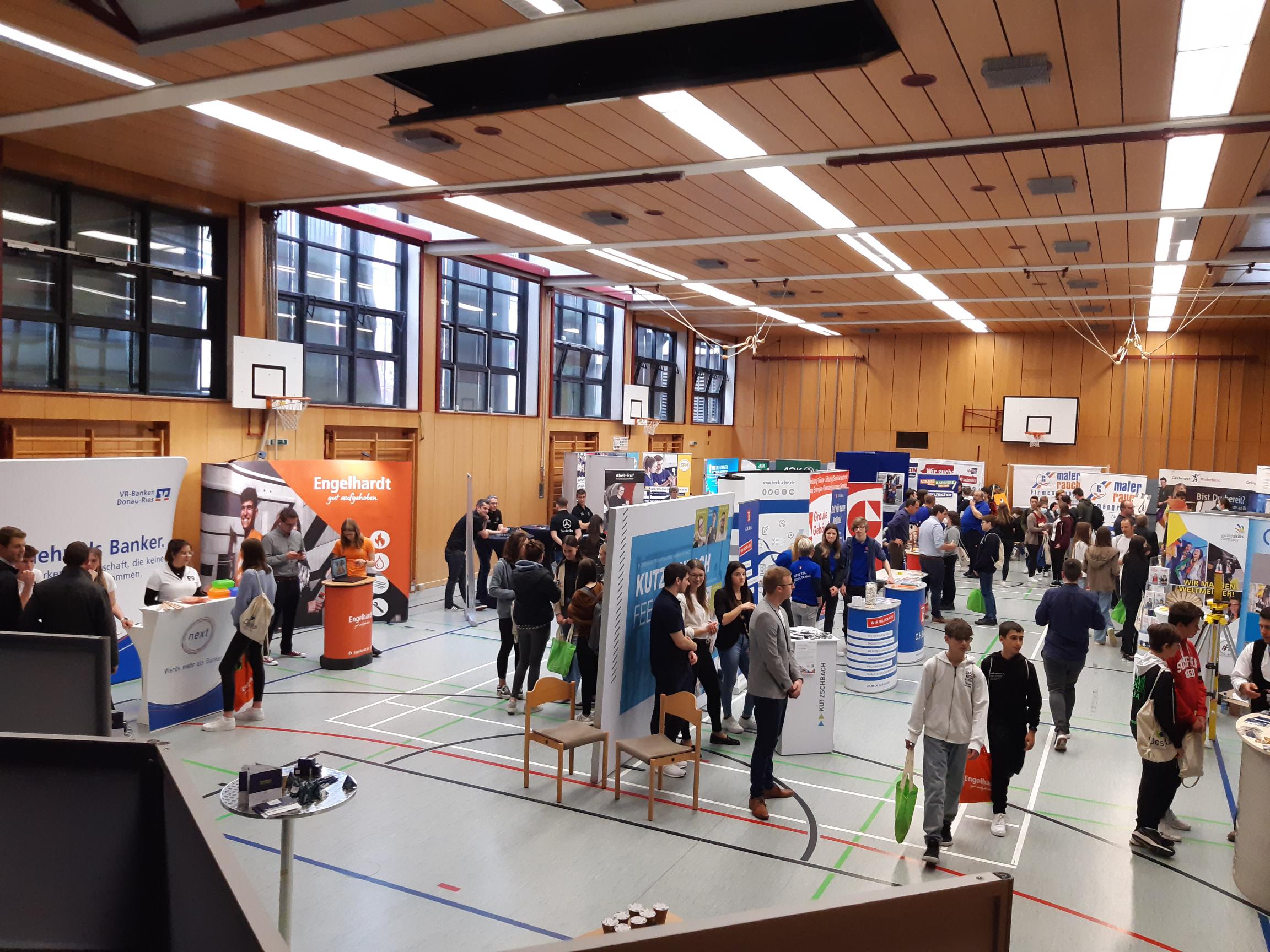Mit 26 Informationsständen von verschiedenen Nördlinger und Rieser Firmen war der Berufskundetag an unserer Realschule in diesem Jahr so groß wie noch nie. Die Schülerinnen und Schüler der achten und neunten Klassen unserer Schule sowie der Maria Ward Realschule Wallerstein und der Mittelschule Nördlingen konnten sich über soziale Berufsfelder genauso informieren wie über technische. Neben der Ausstellung der Firmen erhielten die Schülerinnen