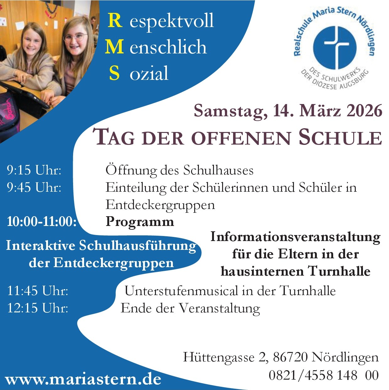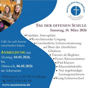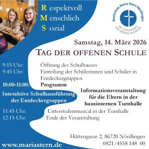 Das von der Diözese Augsburg geförderte MFM-Programm (übersetzt My Fertility Matters = Meine Fruchtbarkeit hat Bedeutung) begleitet Mädchen, Jungen und deren Eltern in die Phase der Pubertät. Ziel ist es, die körperlichen Veränderungen in der Pubertät in positiver Weise zu erleben, zu schätzen und zu schützen. Zu diesem Zweck fand im Vorfeld des vom Elternbeirat und Freundeskreis unterstützten Projekts ein Elternabend mit Dr. Pascal Gläser statt, um den Erziehungsberechtigten das Programm zu erläutern.› mehr
